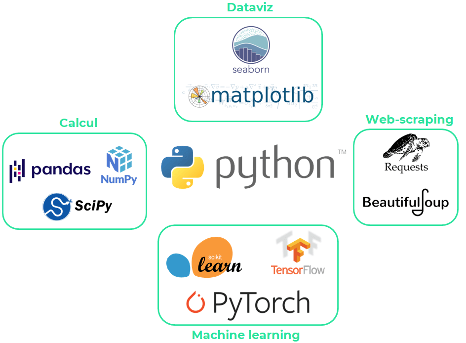 Matplotlib et Seaborn : Utilisées pour la visualisation des données, elles facilitent la création de graphiques et de visualisations claires pour interpréter et partager les résultats d'analyses.
